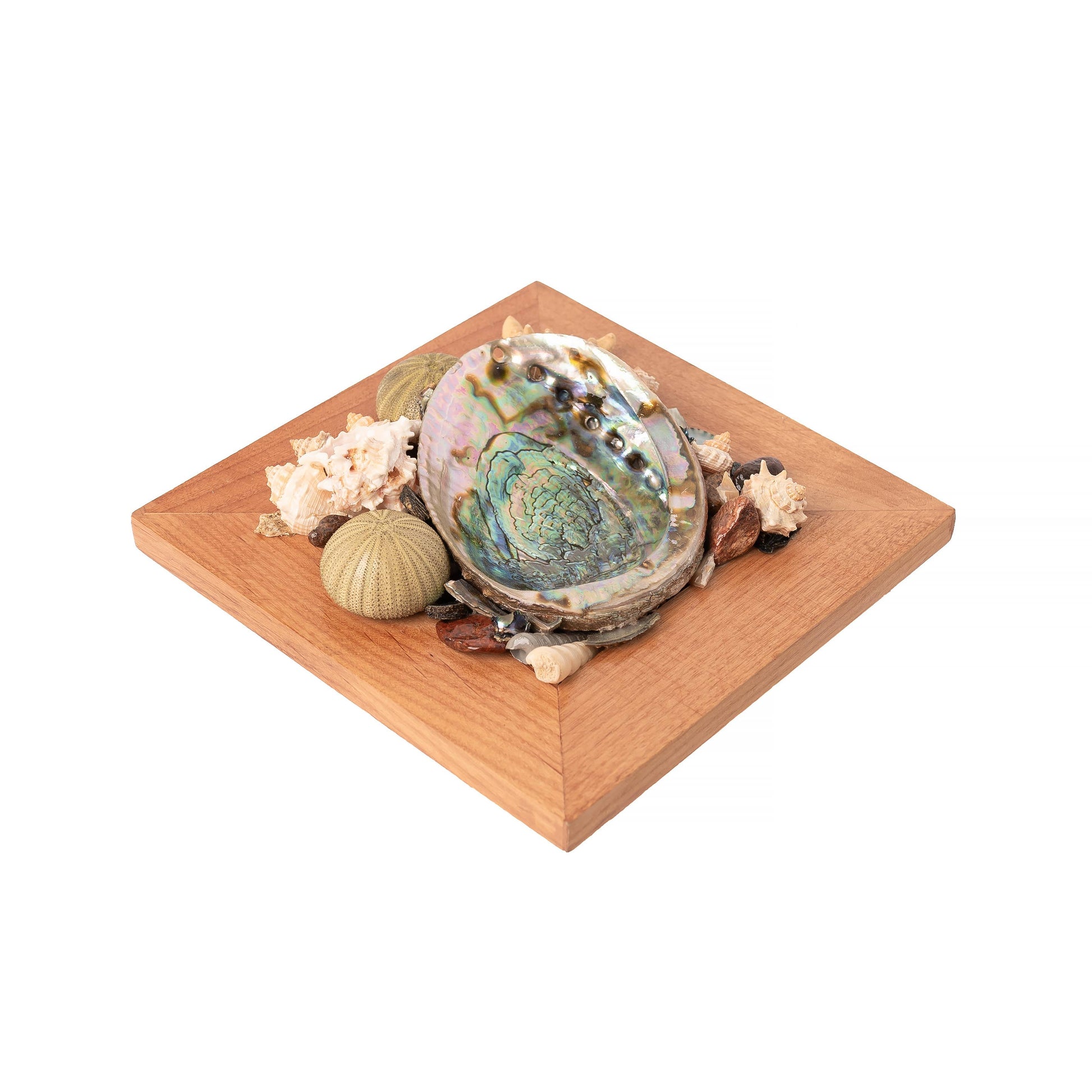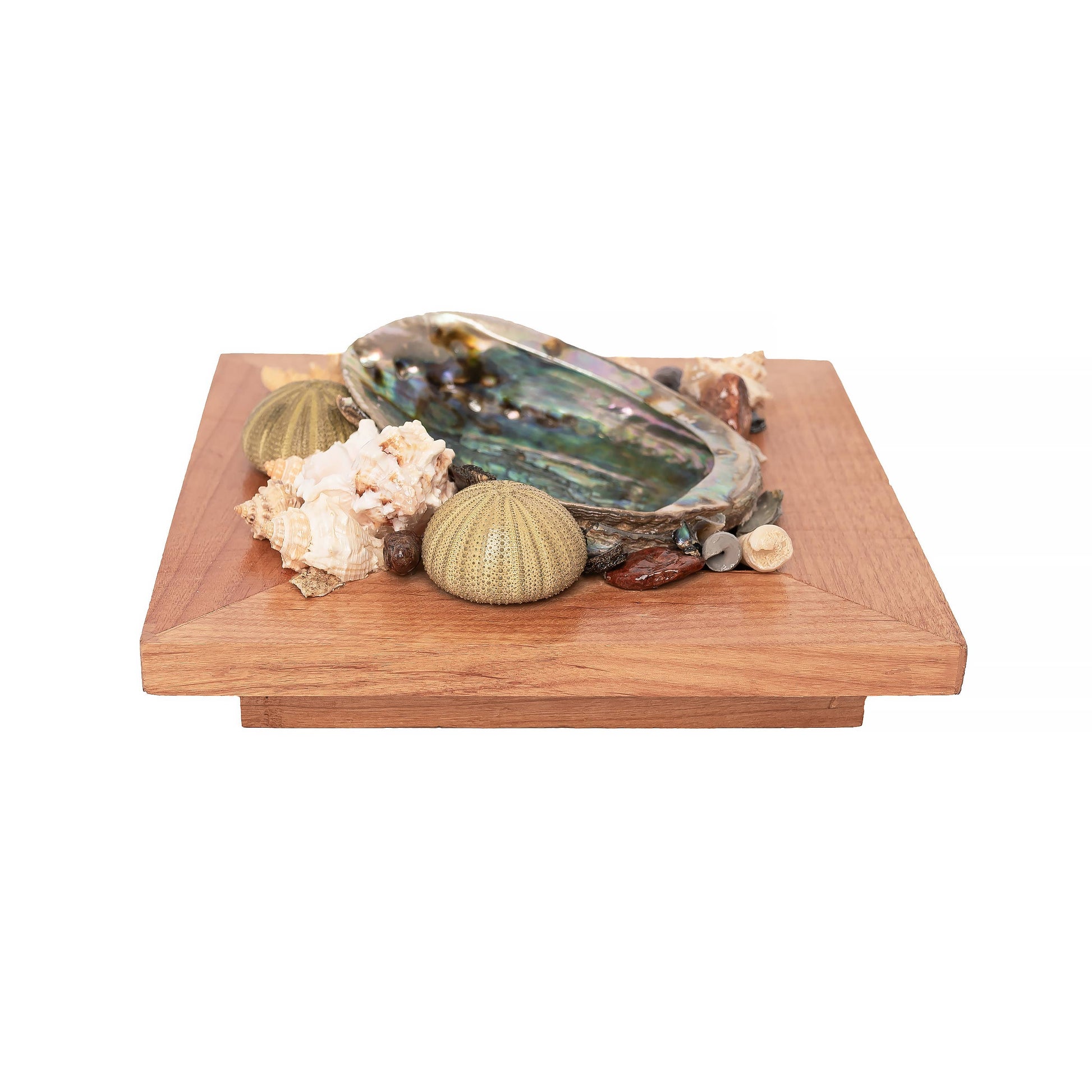 The focal point of the stand is, of course, the abalone shell itself. The shell is sourced from the depths of the ocean, where these iridescent treasures are found. Its mesmerizing hues shimmer and shift in the light, ranging from opalescent blues and greens to flashes of pink, purple, and silver. Each shell is unique, bearing the intricate patterns and textures that make abalone shells so captivating.