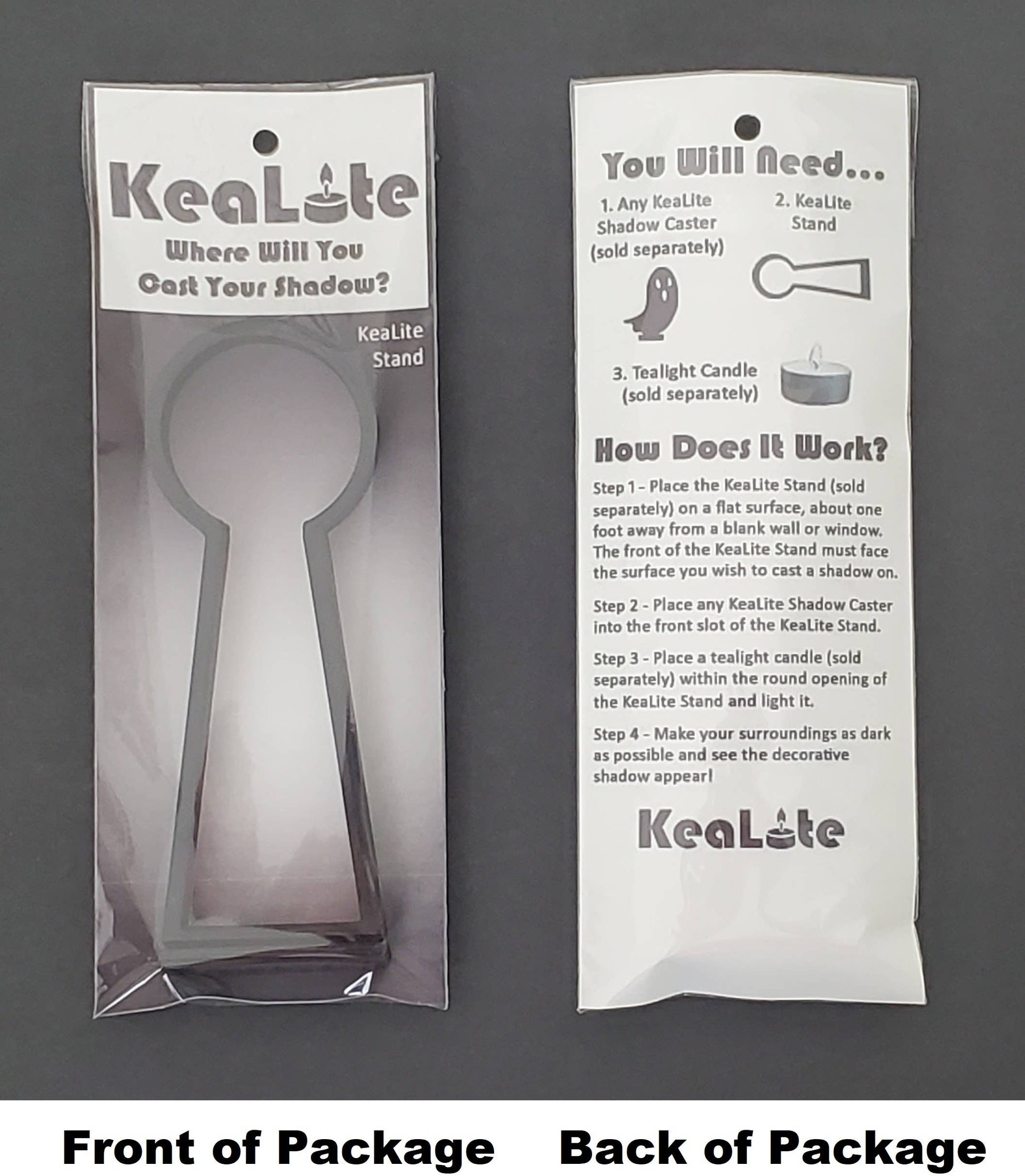 *Please note that KeaLite Shadow Casters are sold separately. Dimensions: KeaLite Stands are sold in packaging and are 3 inches wide by 8 inches tall. Shipping: KeaLite is currently only ships within the United States of America. How Does It Work? Step 1 - Place the KeaLite Stand on a flat surface, about 1 away from a blank wall or window. The front of the KeaLite Stand must face the surface you wish to cast a shadow on. Step 2 - Place any KeaLite Shadow Caster (sold separately) into the front slot of the KeaLite Stand. Step 3 - Place a tea light candle (sold separately) within the round opening of the KeaLite Stand and light it. Step 4 - Make your surroundings as dark as possible and see the decorative shadow appear!