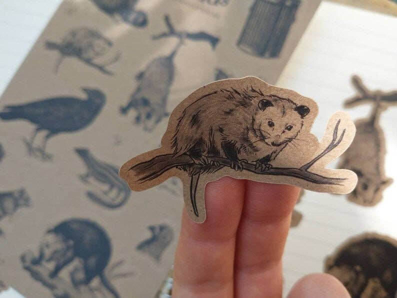 These beautiful kraft paper stickers feature vintage illustrations of raccoons, possums, pigeons, a rat, skunk, crow, trash can and mouse! All kinds of trash friends.